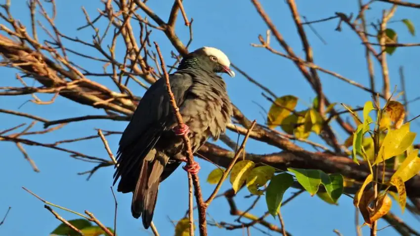 White-headed dove. It is a large pigeon of about 35 centimeters, dark gray in color. The neck has a greenish or violet metallic tinge; the feathers of the crop, neck and dorsal region are edged with black, the legs are red and the bill is dark. Both the male and the female have a white crown on the head that reaches the eyes and the beak. In white the crown is immaculate white. Photo: Tania Piñeira.