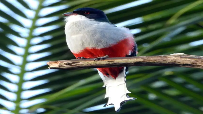 The Cuban Trogon is Cuba's national bird – its coloring representing the red, blue and white of the national flag. It is found in forest especially near streams. It is shiny dark green above with a violet crown and nape. Below it is white on the throat and chest but bright red on the belly and undertail coverts. The wings are marked with green, black and white, the bill is reddish with a darker upper mandible and the iris is red. The "flared" shape of the tail is unique amongst trogons. It feeds by hovering. Its diet consists of nectar, fruit and insects.